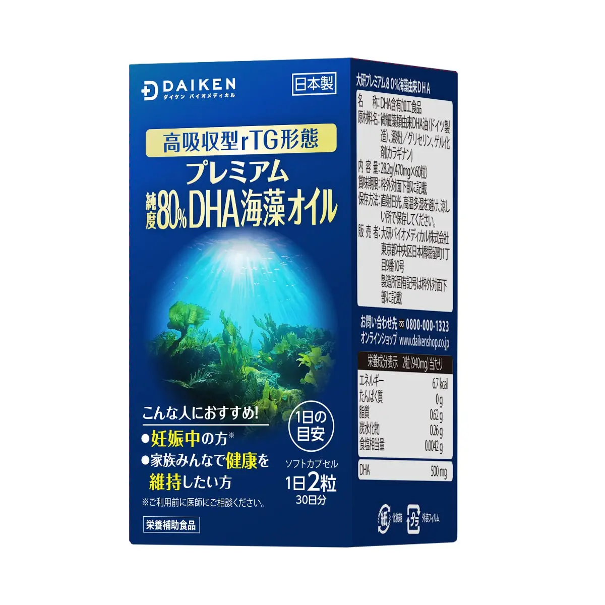 こうした背景を受け、大研バイオメディカルでは魚に頼らないDHAの選択肢として、海藻由来のDHAを使用したサプリメント「プレミアム80%DHA海藻オイル」を開発しました。