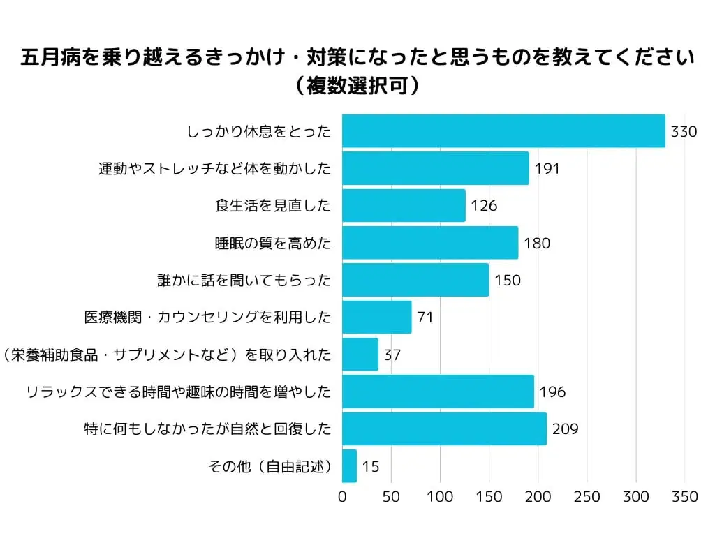 次いで「リラックスできる時間や趣味の時間を増やした」(196人)、「特に何もしなかったが自然と回復した」(209人)という声も目立ちました。