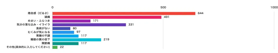 次いで「頭痛」(491件)、「気分の落ち込み・イライラ」(331件)と続き、身体的な不調に加えてメンタル面の不調も多く報告されています。