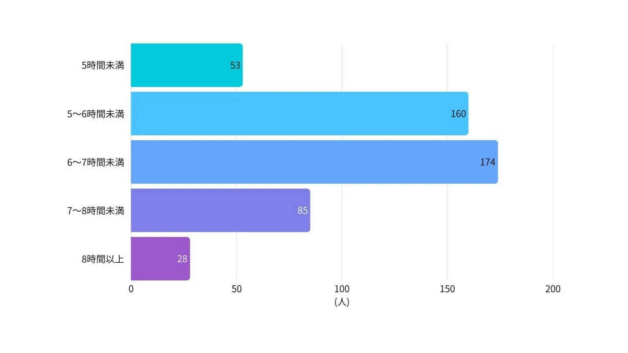 国際的な睡眠指針(*1)では成人に必要とされる睡眠は7〜8時間とされますが、これを実現できているのは22.6%にとどまっています。さらに「5時間未満」と答えた人も10.6%にのぼり、慢性的な睡眠不足が健康リスクとして社会全体に広がっている実態が浮き彫りになりました。