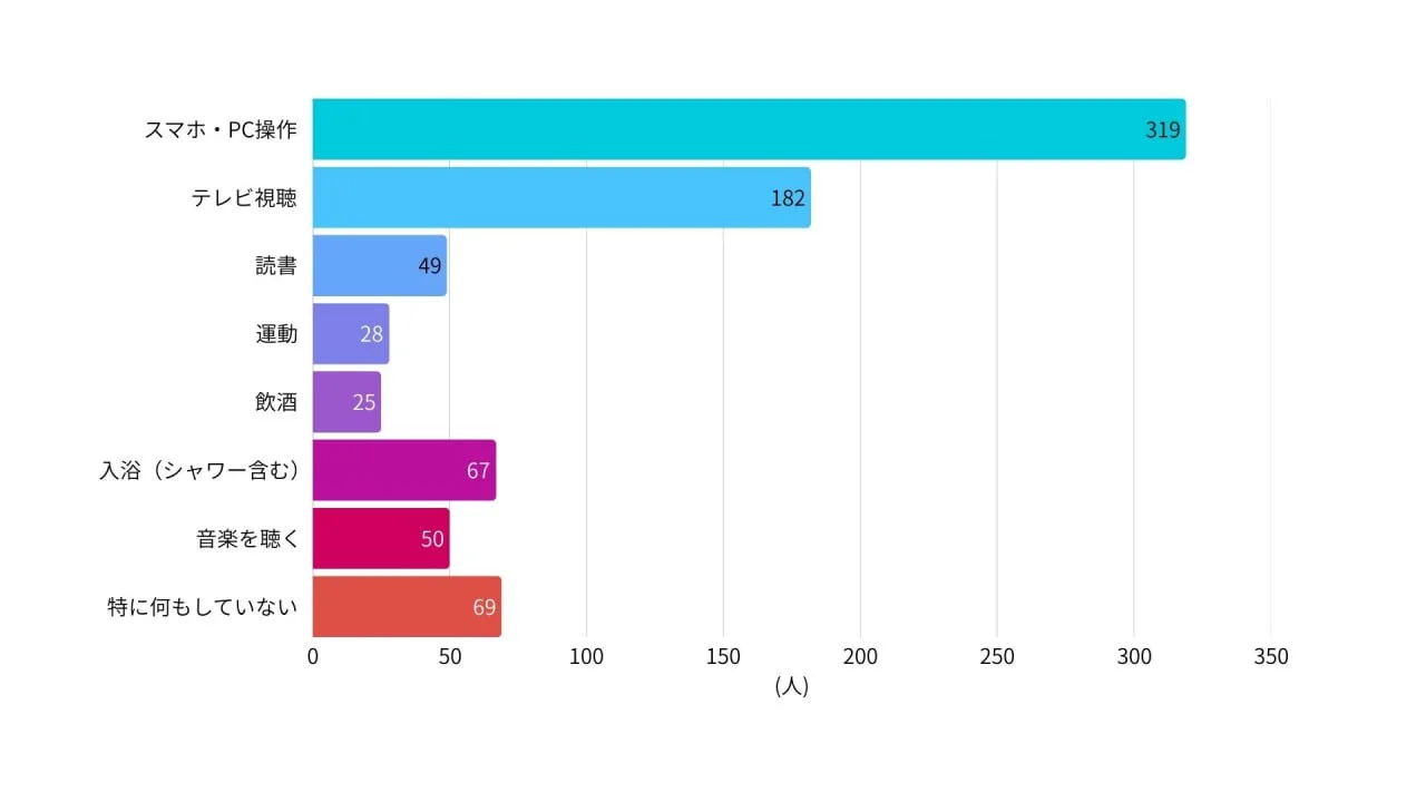 就寝前1時間以内に行う習慣については、63.8%が「スマホ・PC操作」と回答し、圧倒的に多い結果となりました。次いで「テレビ視聴」(36.4%)、「特に何もしていない」(13.8%)が挙がりました。